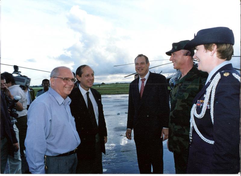 Vice President Enrique Bolaños of Nicaragua, Ambassador Lino Gutiérrez, Defense Minister Pedro Joaquín Chamorro as U.S. helicopters arrive in Nicaragua after Hurricane Mitch